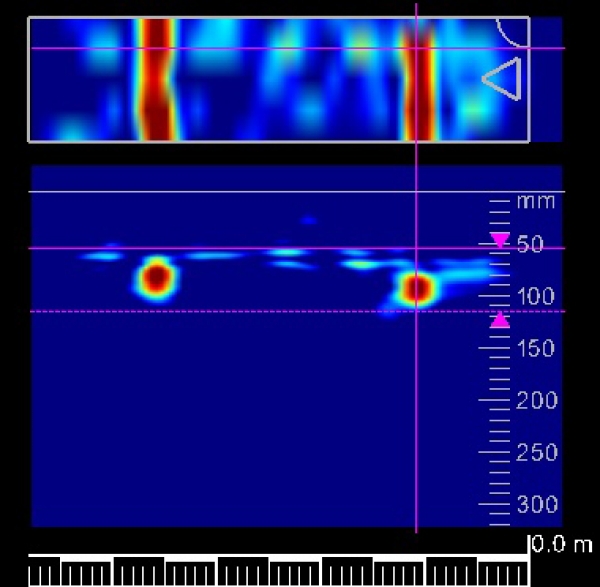 レーダー探査(鉄筋探査)とは、構造物内部の埋設物(主に鉄筋、電気配線管等)の位置を非破壊で特定することのできる探査です。