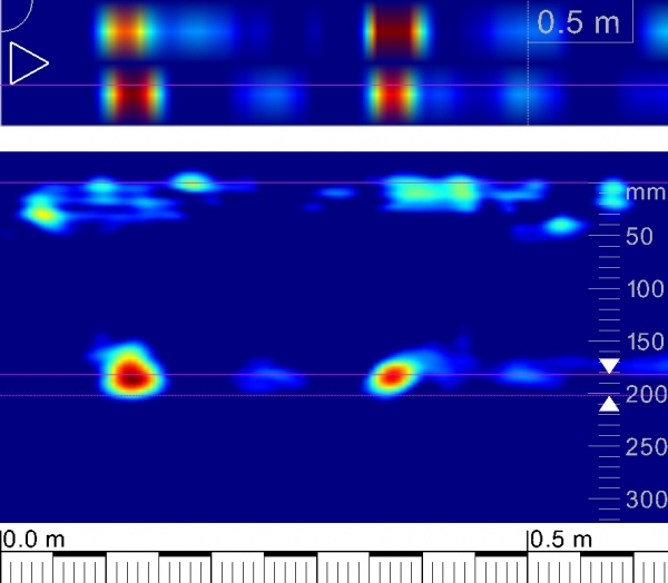 レーダー探査(鉄筋探査)とは、構造物内部の埋設物(主に鉄筋、電気配線管等)の位置を非破壊で特定することのできる探査です。