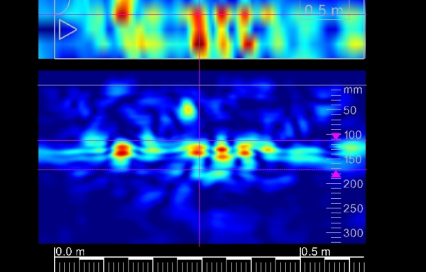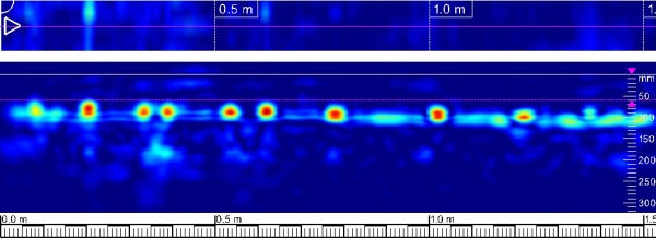 レーダー探査(鉄筋探査)とは、構造物内部の埋設物(主に鉄筋、電気配線管等)の位置を非破壊で特定することのできる探査です。