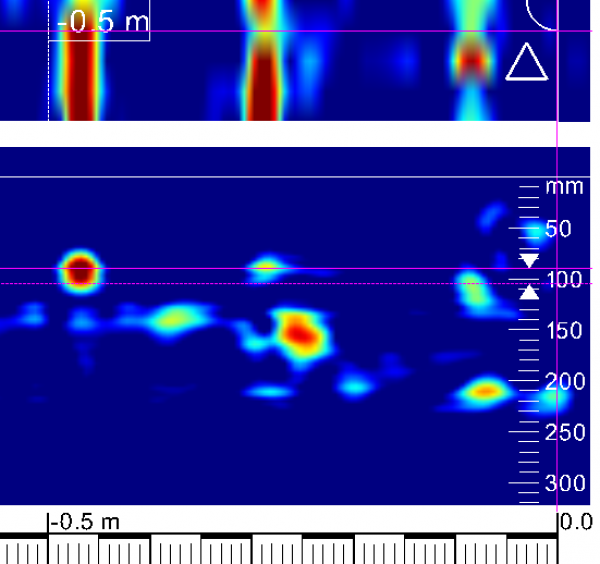 レーダー探査(鉄筋探査)とは、構造物内部の埋設物(主に鉄筋、電気配線管等)の位置を非破壊で特定することのできる探査です。